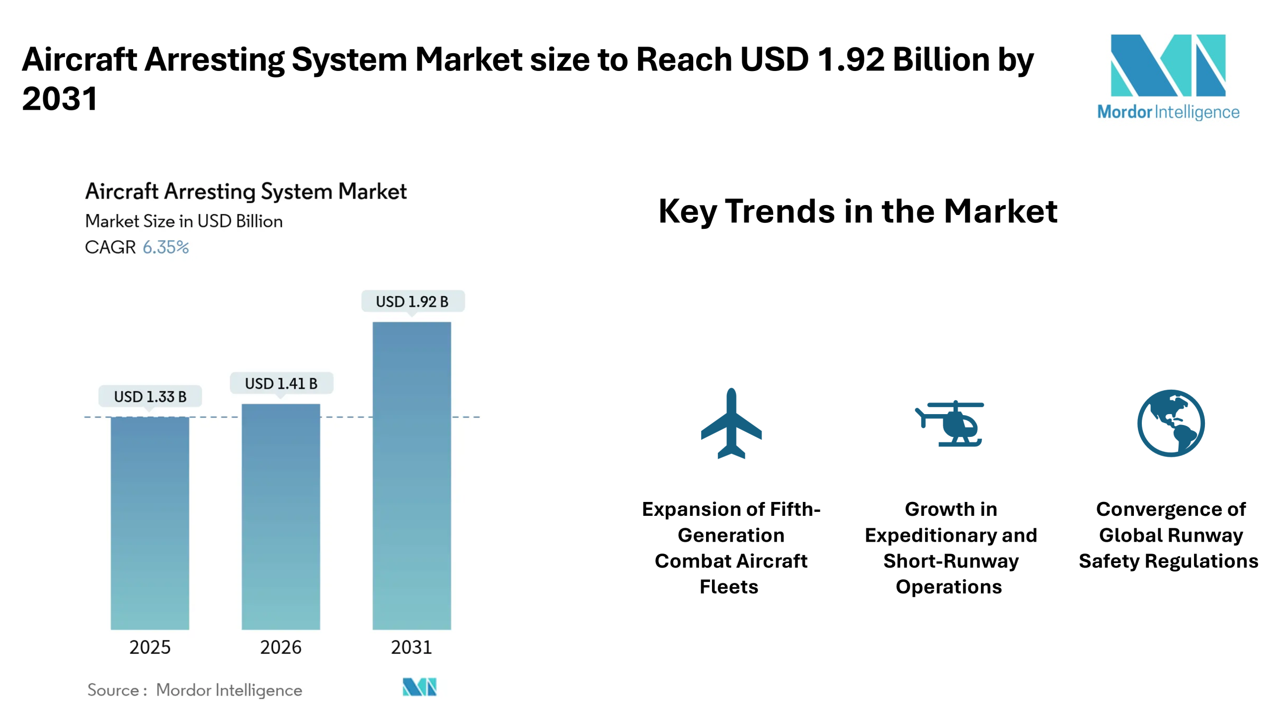 According to Mordor Intelligence, the aircraft arresting system market size was valued at USD 1.41 billion in 2026 and reach USD 1.92 billion by 2031, registering a CAGR of 6.35% during the forecast period. The aircraft arresting system market size is supported by rising investments in advanced fighter aircraft, aircraft carrier modernization programs, and stricter runway safety requirements across commercial airports.