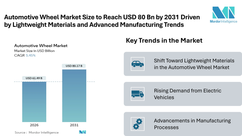 According to Mordor Intelligence, the automotive wheel market size is witnessing steady expansion, with the market size valued at USD 61.49 billion in 2026 and projected to reach USD 80.17 billion by 2031, registering a CAGR of 5.45%. This automotive wheel market growth reflects consistent demand from both passenger and commercial vehicle segments, along with increasing focus on performance, safety, and efficiency.