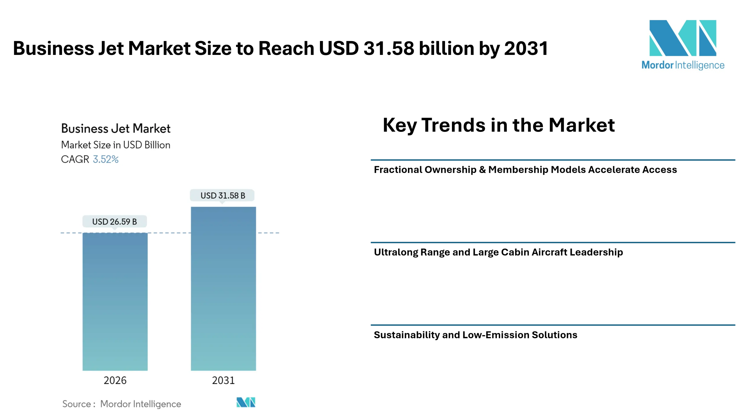 The business jet industry continues its steady expansion as global mobility needs evolve and demand for private air travel rises. The business jet market size is estimated at USD 26.59 billion in 2026 and is projected to reach USD 31.58 billion by 2031, representing a CAGR of 3.52% during 2026–2031.