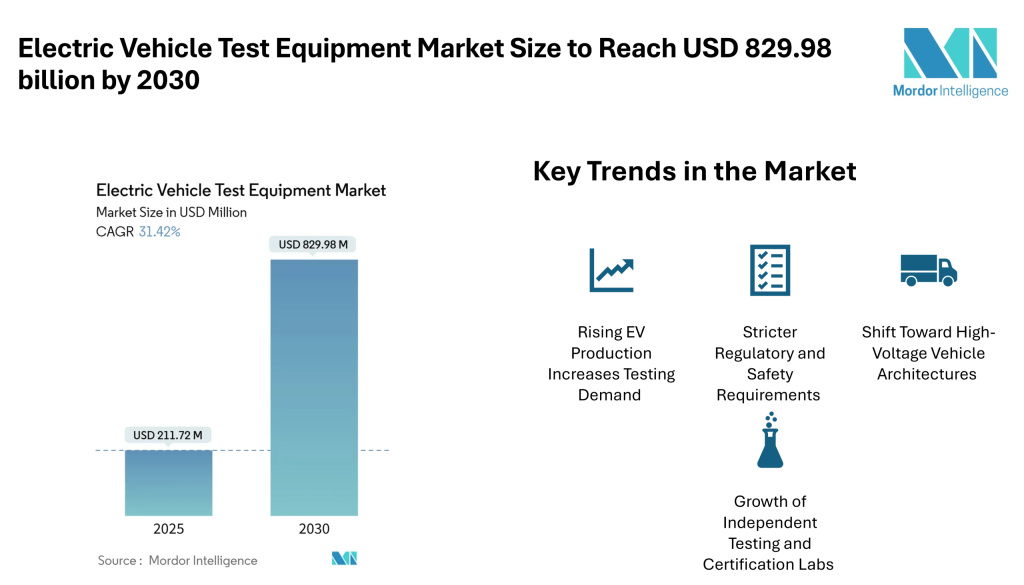 The global Electric Vehicle Test Equipment market size is witnessing rapid growth as electric vehicle production continues to scale worldwide. According to Mordor Intelligence, the market was valued at approximately USD 211.72 million in 2025 and is projected to reach around USD 829.98 million by 2030, registering strong growth over the forecast period. This expansion is driven by increasing EV model launches, rising adoption of high-voltage vehicle architectures, and the need for advanced validation of batteries, power electronics, and charging systems.