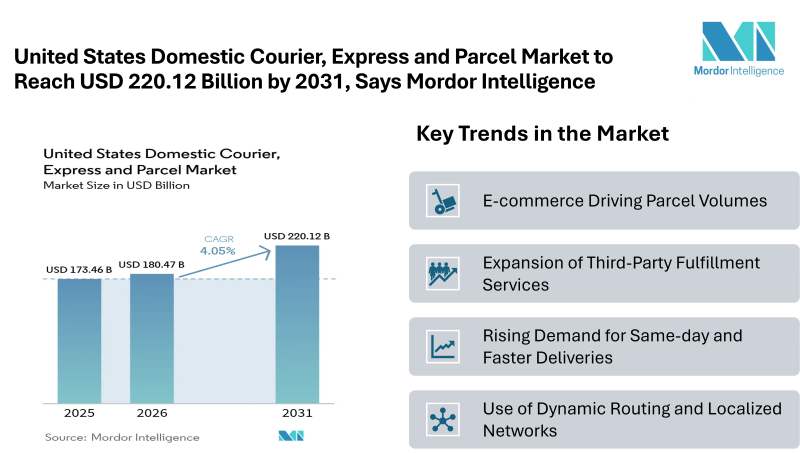 According to Mordor Intelligence, the United States domestic courier, express and parcel market size is expected to grow from USD 173.46 billion in 2025 to USD 180.47 billion in 2026 and is forecast to reach USD 220.12 billion by 2031, registering a CAGR of 4.05%. The parcel market continues to reflect steady expansion supported by rising parcel volumes and evolving delivery expectations across the country.
