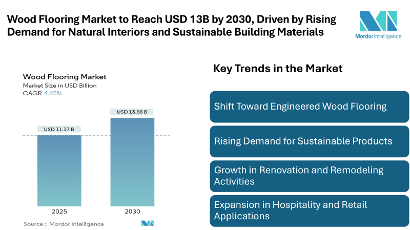 According to Mordor Intelligence, the Wood Flooring Market size is estimated at USD 11.17 billion in 2025, and is expected to reach USD 13.88 billion by 2030, at a CAGR of 4.45%, supported by consistent demand from housing renovation, new construction activity, and interior design upgrades. The market is witnessing stable expansion as consumers increasingly prefer flooring materials that combine aesthetics with durability and environmental compatibility. The wood flooring market continues to gain steady attention across residential and commercial construction due to its natural appearance, durability, and long-term value.